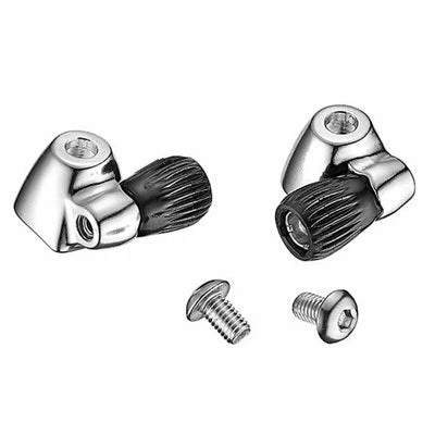 Ces butées de gaines de dérailleur se vissent sur le cadre du vélo. Elles sont idéales pour équiper les vieux vélos de courses qui avaient les manettes de dérailleur vissées sur le cadre. Ces deux butées en aluminium sont fournies avec les vis de réglage de câble de dérailleur. Le lot comprend ainsi :